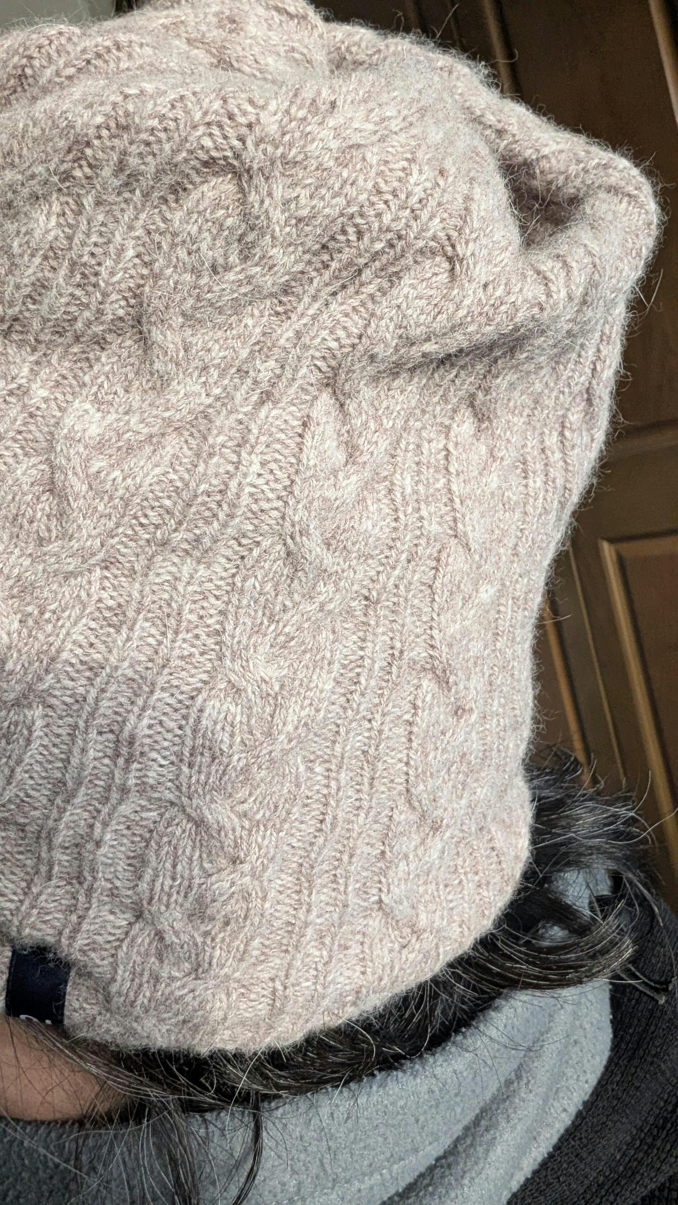 表地はふわふわの毛糸の感触が楽しめます。裏地はチクチクしない柔らかい別の編地で作らていて、頭や首周りののチクチク感が少ないです。